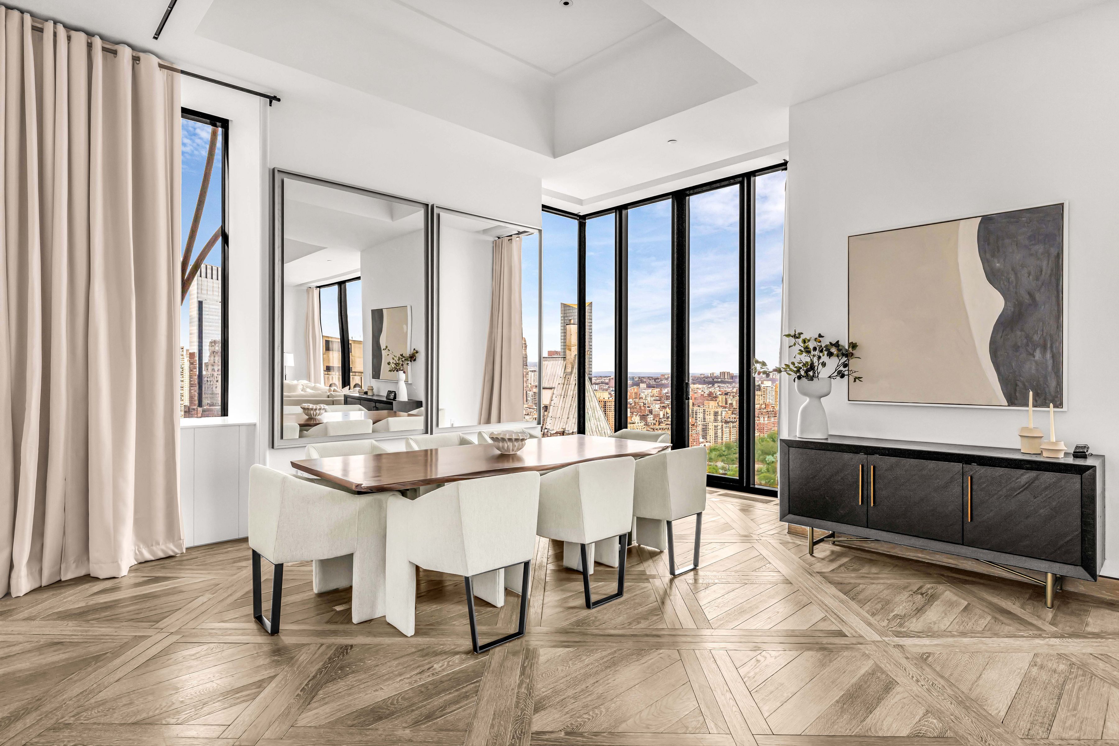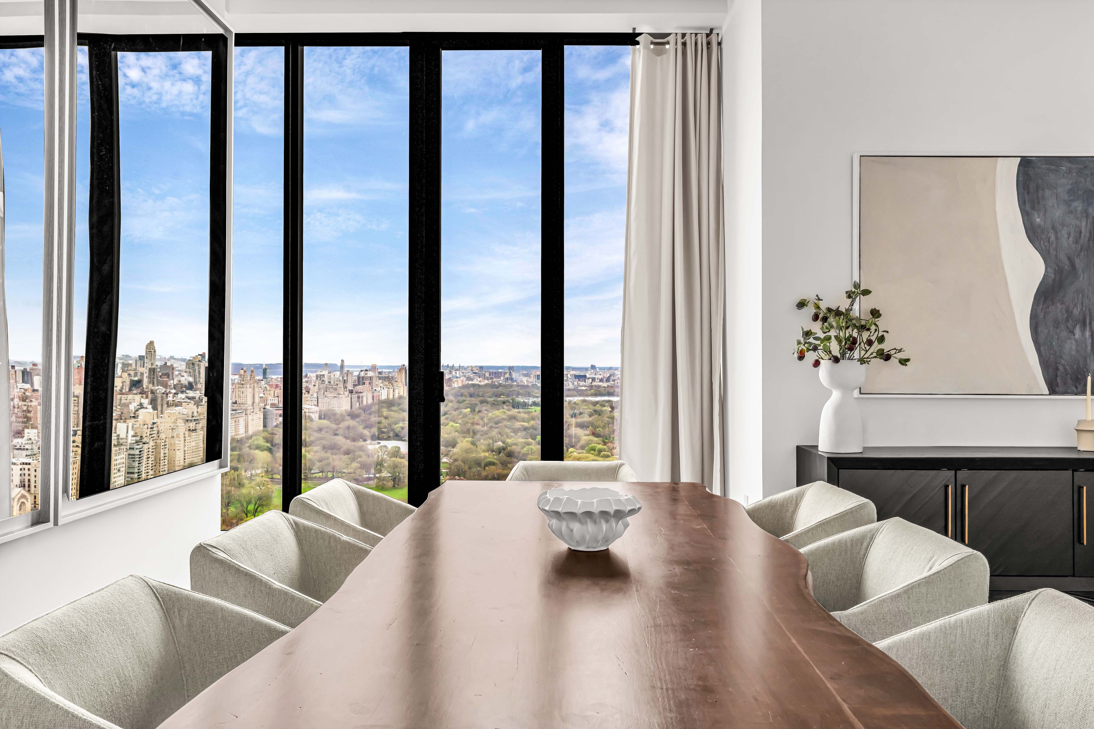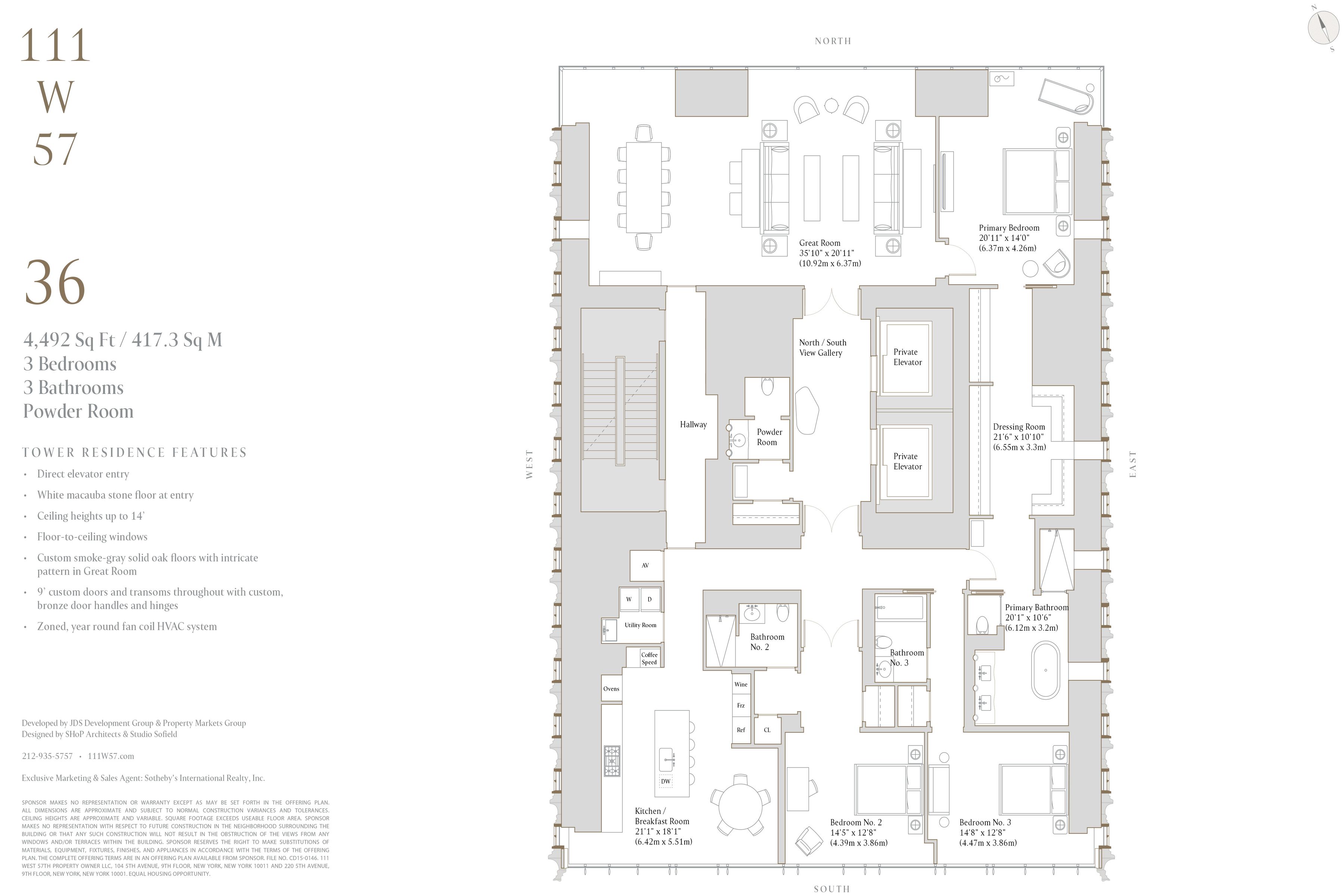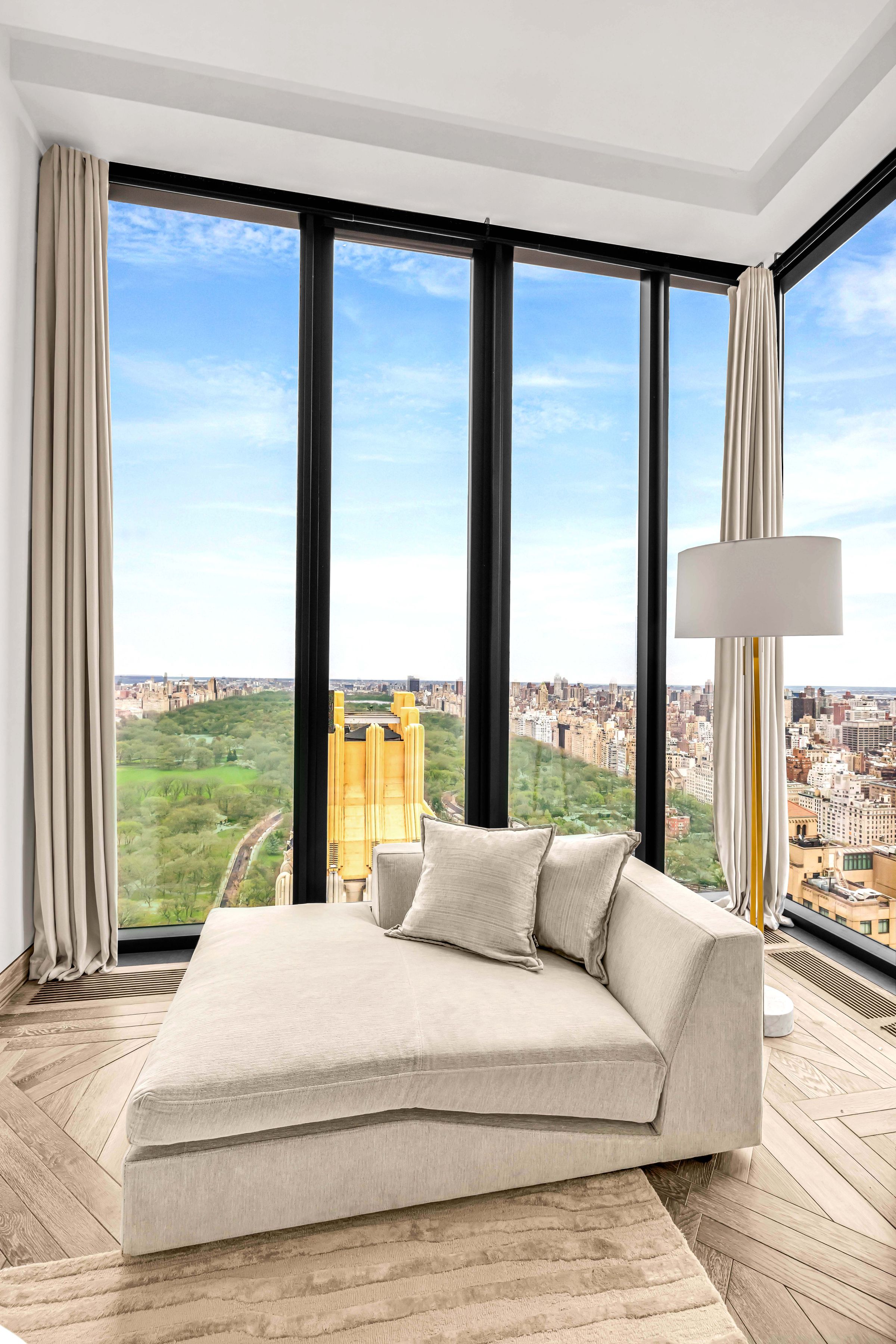 IMMEDIATE OCCUPANCY - Last Remaining Full Floor Designed by the renowned Studio Sofield, recognized for their impeccable craftsmanship, this 4,492 sqft residence offers a direct elevator Entry Gallery which leads into a sprawling full-floor, 3 Bedroom, 3.5 Bathroom Tower Residence. The formal Entry Gallery is finished with white macauba stone floors and offers a dramatic North to South view which opens into the sumptuous Great Room. This incredible space is highlighted by 14-foot ceilings and floor-to-ceiling windows which showcase unrivaled, perfectly centered views over Central Park. The luxuriously appointed Primary Bedroom Suite features northern, perfectly centered, Central Park views, a windowed pass through Dressing Room leading into a windowed Bathroom clad in hand selected veined white onyx. The custom freestanding polished nickel bathtub is by William Holland and beautiful, custom-designed fixtures are hand-cast by P.E. Guerin, the only foundry still operating in New York City. The Secondary Bedrooms, each with striking southern skyline views, are generously proportioned with en-suite bathrooms finished in a distinctive crystallo gold quartzite and custom Studio Sofield designed fixtures. The corner, south-facing Kitchen offers a generous breakfast area, custom cabinetry designed by Studio Sofield, crystallo white quartzite countertops and backsplash, and a full suite of Gaggenau appliances, including gas cooktop with fully vented hood, steam oven and wine fridge. A powder room with a jewel onyx stone vanity, floors and wainscoting completes this grand residence. 111 West 57 an elegant tower of glass, terracotta and bronze, rising to 1,428' and perfectly centered, overlooking Central Park. It is the premier Condominium along West 57th Street, offering extraordinary views, boutique sophistication, and an unparalleled level of privacy and highly-personalized services. Residents at 111 West 57 will enjoy exclusive concierge service and a rare, private porte cochere entrance on 58th Street for the utmost in security and privacy. Club 111 and Sports Club include: -Complementary daily breakfast for all residents catered by Le Bilboquet -Wellness and Lifestyle Concierge Services -82' two-lane Swimming Pool with Private Cabanas -Separate Sauna and Treatment Rooms -Double-height Fitness Center with mezzanine Terrace -Private Club space with Dining/Meeting rooms, Bar/Coffee service, Living Areas, Library and an expansive double-level Terrace. -Chef's catering Kitchen -Manhattan's first private Padel court -Golf Simulator -Children's Playroom *Please note the padel court, golf-simulator, and children's playroom are part of Non-Residential 2 Unit and are owned and controlled by the Non-Residential 2 Unit Owner. Additional fees may apply.
