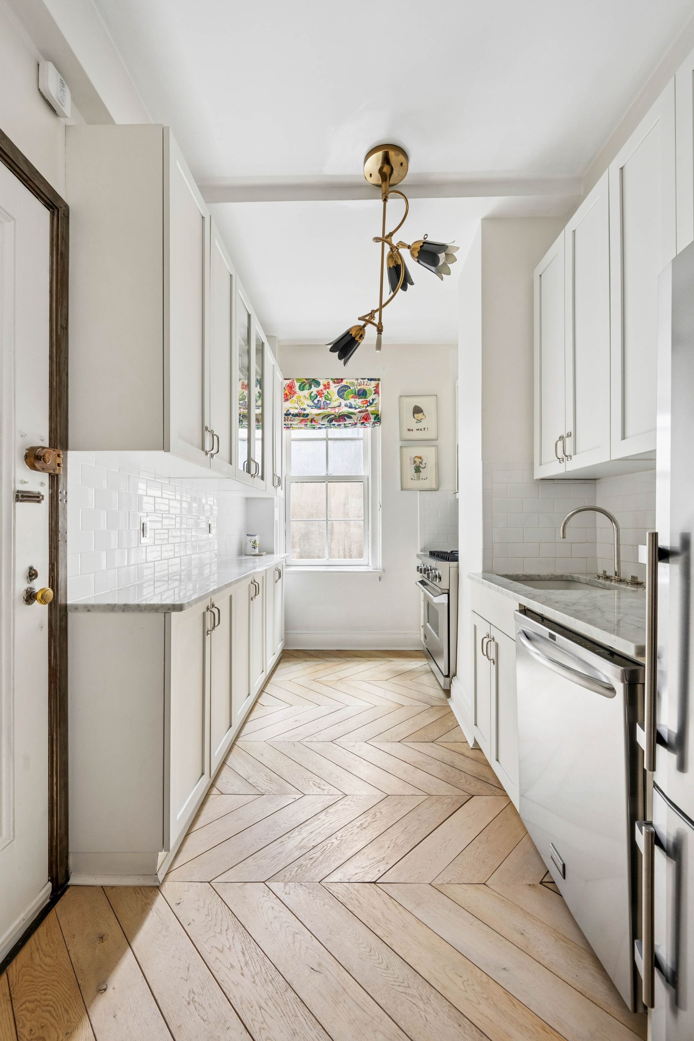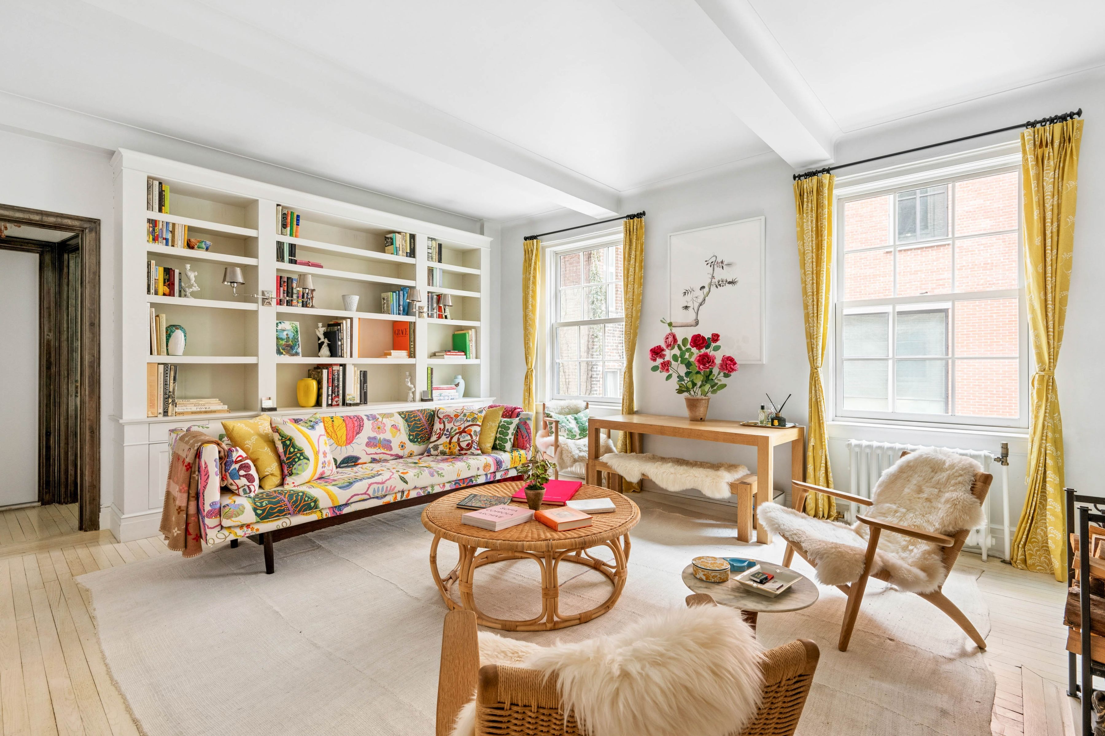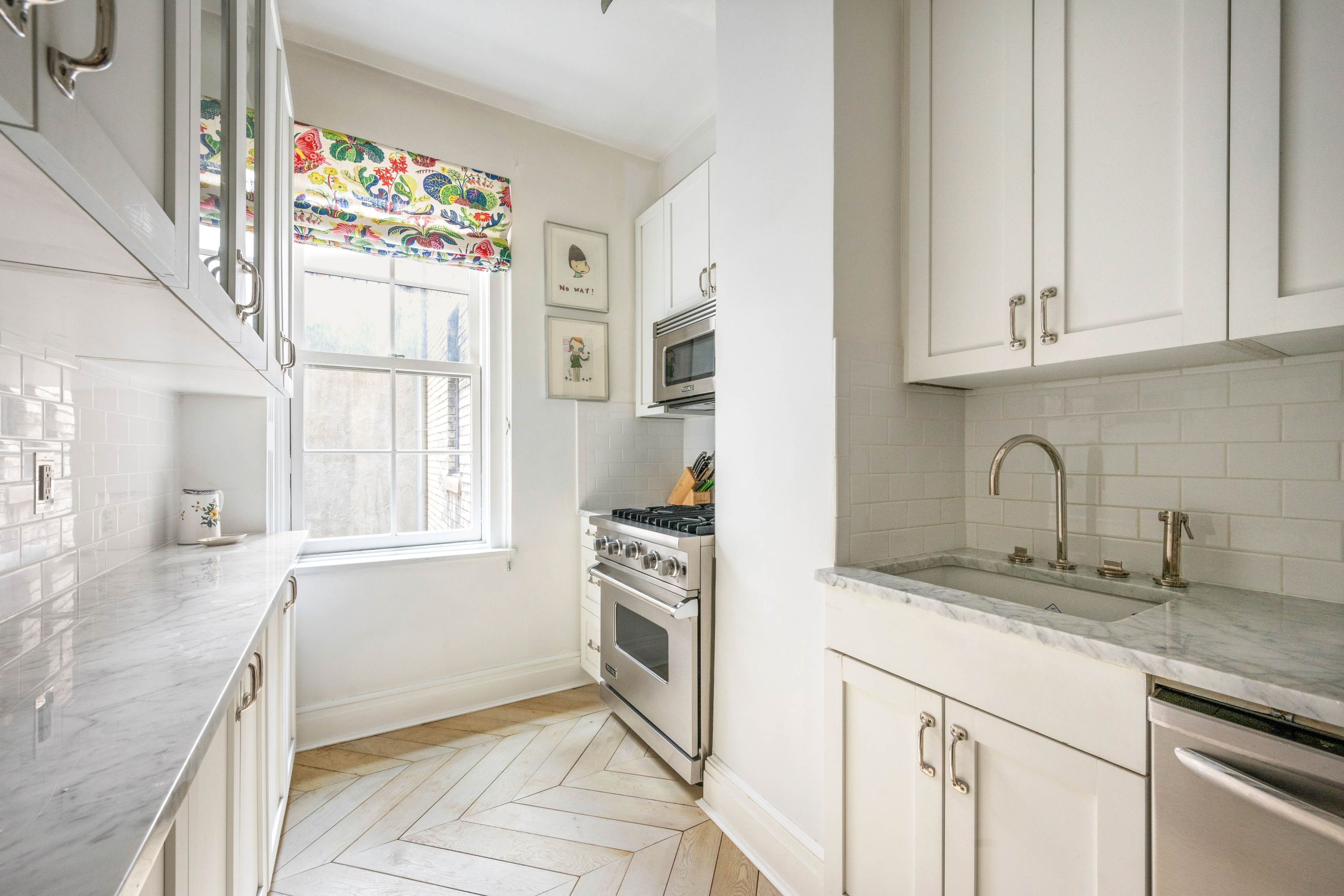 A chicly renovated and unusually spacious one-bedroom in the heart of Greenwich Village's Gold Coast. This thoughtfully designed home blends classic prewar character with a warm, modern sensibility, offering an elevated take on downtown living within a full-service building. A proper entry foyer sets the tone, creating a true sense of arrival. The living room is generously scaled for a one-bedroom, anchored by a wood-burning fireplace and custom built-in bookcases--and enjoys a quiet, private feel. The proportions throughout are exceptional, delivering a sense of volume and ease rarely found at this level. The windowed kitchen is both refined and highly functional, featuring white oak chevron floors, ample cabinetry, and a suite of high-end appliances. The bathroom is finished entirely in Waterworks and includes both a soaking tub and window. The bedroom is serene and well-proportioned, complete with custom built-ins and an additional closet. Thoughtful details throughout include: - White oak chevron flooring and restored, bleached original hardwood floors - Viking range and microwave, Liebherr refrigerator - Shaw's England sink with Waterworks faucet - Library sconces from Galerie des Lampes, Paris - Pierre Frey "Le Manach L'Arbre Indien" wallpaper (bath) - Josef Frank "Kloverblad" wallpaper (foyer) - Forbes & Lomax switches and outlets 35 West 9th Street is a full-service prewar cooperative with doorman and live-in superintendent, moments from Washington Square Park and the best of downtown dining and shopping. The building permits pieds-a-terre on a case-by-case basis. Building amenities include storage and laundry room. There is a 1% transfer fee.