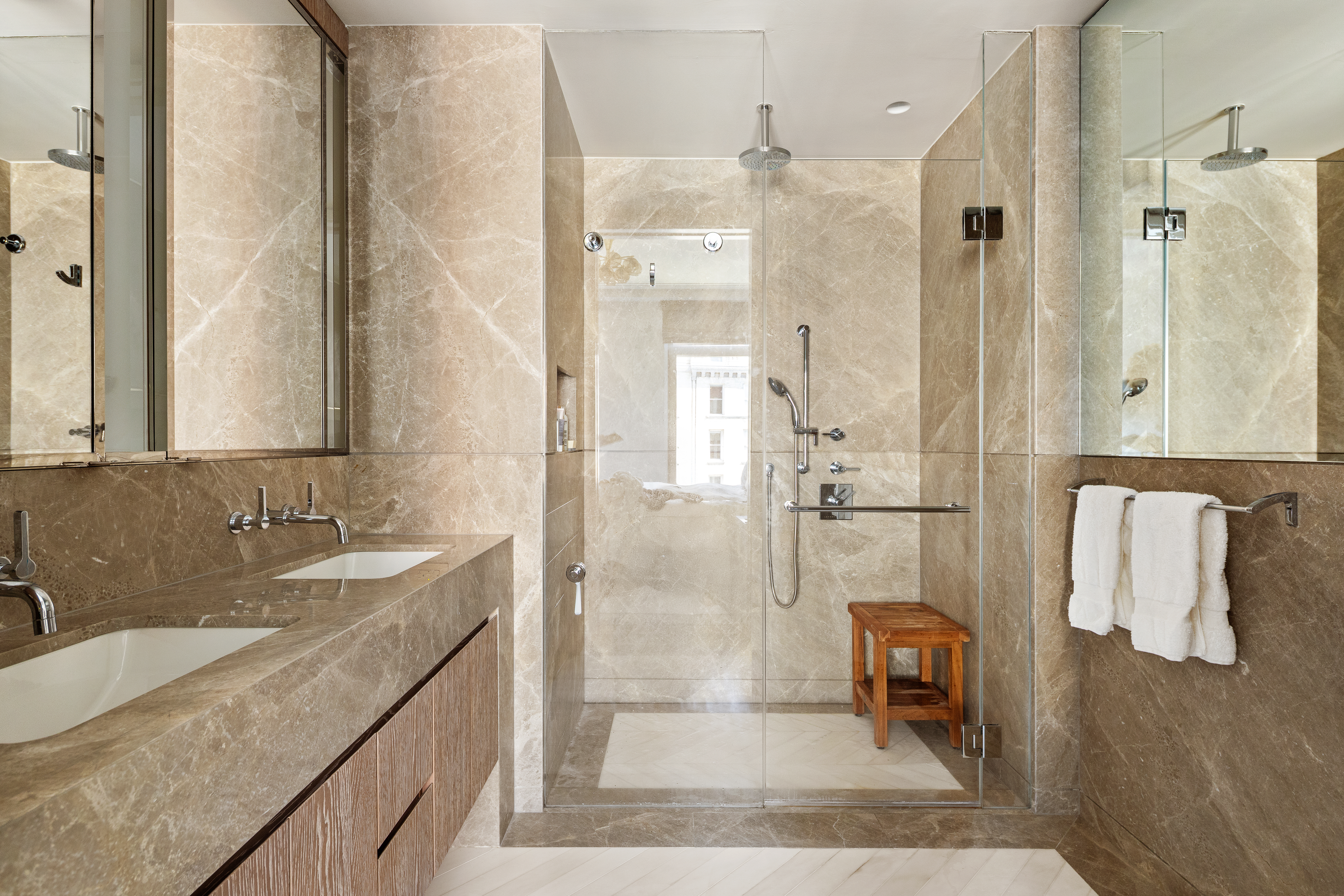 Residence 6C - 40 Bleecker Set in one of downtown's most desirable new developments, Residence 6C at 40 Bleecker is a rare opportunity to own a fully customized, move-in-ready home in the heart of NoHo. This 2 bedroom, 2 bath residence spans 1,093 square feet and has been reimagined by designer Alexander Doherty, elevating Ryan Korban's original vision with architectural refinements, bespoke millwork, and advanced systems that make it stand out not only from other homes in the building, but also from others in the same C-line. Living & Dining 10-foot coved ceilings and chevron patterned oak floors establish scale and character. A custom illuminated bookcase between the living room windows adds both architectural detail and a striking focal point. Recessed lighting and built-in speakers, supported by a Marantz receiver and built-in subwoofer, deliver high-quality sound throughout the space. Oversized windows face Mulberry and Lafayette Streets, bringing in abundant natural light and durable, open views unobstructed by neighboring buildings. The kitchen, designed by Ryan Korban, remains a sculptural centerpiece with a statuary marble island, Italian cerused oak cabinetry with bronze fluted glass, a full suite of Miele appliances (including app-enabled dishwasher), a wine fridge, and an app-enabled refrigerator. Layout & Private Quarters The second bedroom wall was thoughtfully reconfigured with pocket doors. When open, it seamlessly extends the living space, creating a den-like experience; when closed, it functions as a true second bedroom, offering rare flexibility within this line. Entry, primary suite, and second bedroom all feature California Closets, while the office/bedroom includes custom built-in shelving with integrated lighting designed by Doherty. A graciously sized AV closet in the hallway provides additional storage and organization. The primary suite also offers a fitted walk-in closet and an en-suite bath in honed Grigio Dove stone, with a Korban designed double vanity, Lefroy Brooks polished chrome fixtures, ceiling speakers, and heated floors with Nuheat app controls. The guest bathroom has been upgraded with a glass enclosed shower, refined stone finishes, and heated floors. Both bedrooms are equipped with integrated speakers for a seamless audio experience. Samsung Frame TV in the primary bedroom and a top-of-the-line Sony TV in the living room, both Savant-integrated. Technology & Comfort Savant smart home system integrating lighting, audio, TVs, HVAC, and both solar and blackout shades in every principal room. Lutron platform underpins Savant controls for lighting and shading. LG washer and dryer with wireless app functionality. Intelli-Tec security and fire monitoring system, a feature that can also help reduce insurance premiums. Building & Neighborhood 40 Bleecker offers premier amenities: state-of-the-art fitness center and a landscaped second floor garden with lounge areas and grill. Services include a 24-hour concierge, building manager, bike storage, BuildingLink system, and a private storage unit included with the residence. At street level, Clean Market, Peachy, and WTHN anchor the retail spaces, complementing the boutiques, dining, and cultural landmarks that make NoHo one of Manhattan's most vibrant neighborhoods. Why 6C is Different Unlike other residences in this line, 6C has been extensively upgraded and customized under the direction of Alexander Doherty, combining Korban's foundation with Doherty's enhancements. From heated floors in every bathroom to California Closets throughout, app-enabled appliances, bespoke millwork, integrated TVs, and a Savant-driven AV system with Marantz receiver and built-in subwoofers, every detail has been carefully considered. The result is a residence that delivers greater comfort, higher